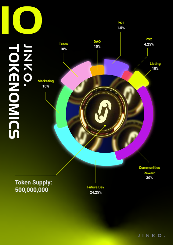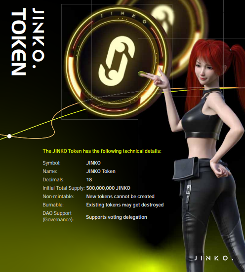 JINKO トークンの技術的な詳細は次のとおりです: シンボル: JINKO 名前: JINKO トークン 小数点: 18 初期総供給量: 500,000,000 JINKO 新しいトークンの作成不可: 新しいトークンは作成できません 燃焼可能: 既存のトークンは破棄される可能性があります DAO サポート(ガバナンス): 投票委任をサポート